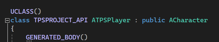 부모클래스를 Character로 하는 Public C++클래스를 만듭니다. 이름은 TPSPlayer 입니다. Visual Studio로 이동하면 새로운 파일이 생겼으므로 리로드 하라고 합니다. 언리얼과 Visual Studio는 서로 다른 환경이라 서로 얽혀있습니다. 이 둘을 잘 이해하셔야합니다. 언리얼의 Character 클래스는 이동과 애니메이션을 담당해주는 클래스입니다. 폰클래스를 상속받습니다.