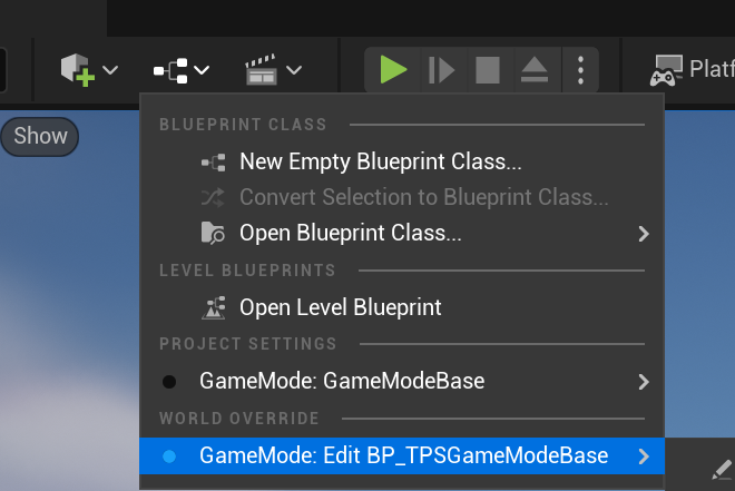 TPSProjectGameModeBase를 부모로 블루프린트를 만들고 이름은 BP_ TPSProjectGameModeBase로 합니다.