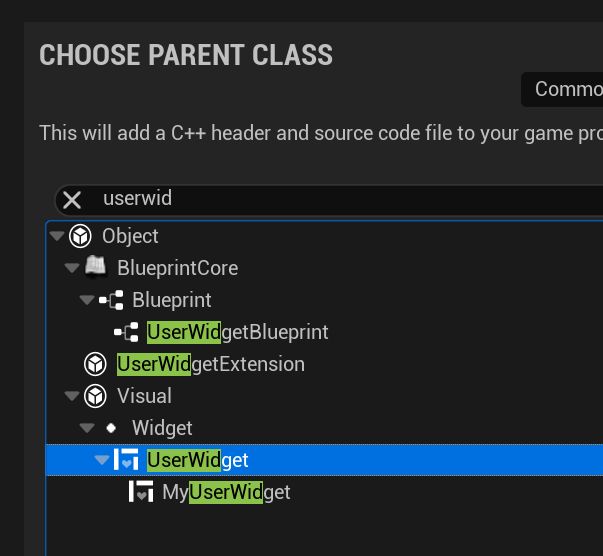 Userwidget을 상속받아 MyUserWidget C++클래스를 만듭니다. 이클래스를 UserWidget 대신 상속시킬겁니다.