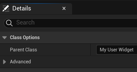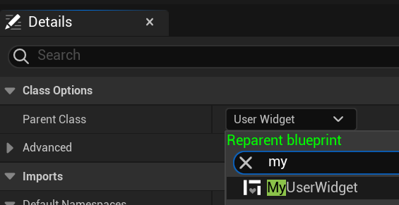 Details패널에서 Parent Class풀다운메뉴에서 MyUserWidget을 선택해서 ReParent해줍니다. 저장해줍니다.