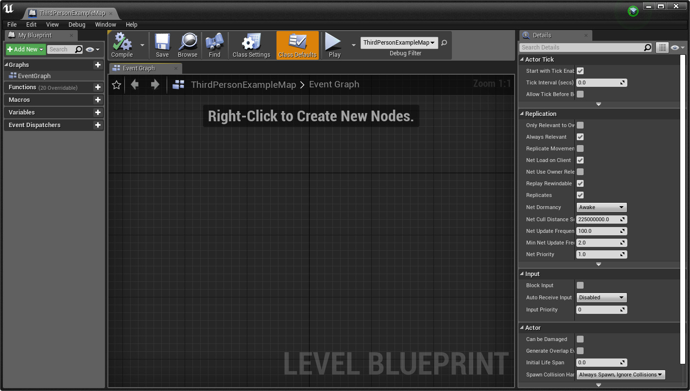 블루프린트 에디터 는 그래프 에디터, 내 블루프린트 패널, 디테일 패널만 사용합니다. 클래스 디폴트 패널은 메뉴 바의