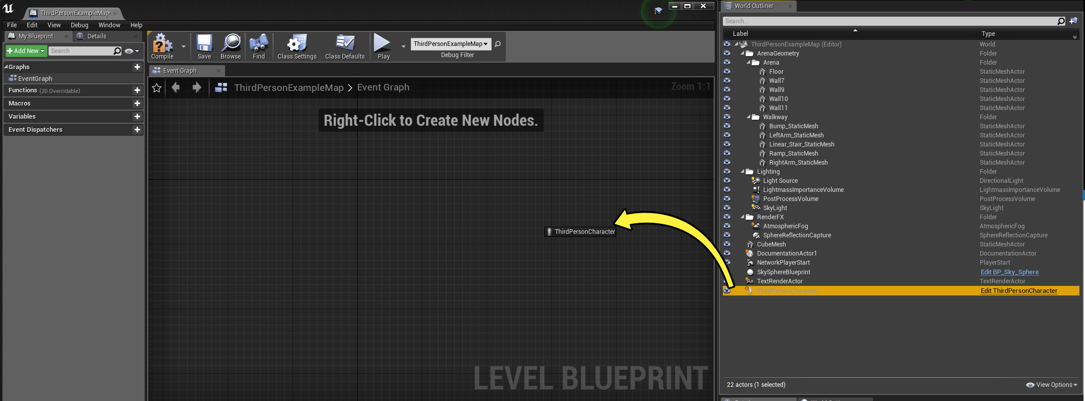 - 월드 아웃라이너 탭에서 액터를 끌어 레벨 블루프린트 의 그래프 안에 놓습니다.