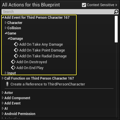 - 나타나는 컨텍스트 메뉴에서 Add Event for [ActorName] ([액터명]에 대한 이벤트 추가)를 펼치고 원하는 이벤트 유형을 선택합니다.