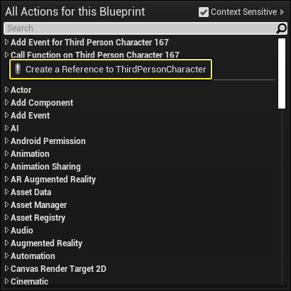 - 나타나는 컨텍스트 메뉴에서 Create a reference to [SelectedActor] ([선택된 액터]에 대한 레퍼런스 생성)을 선택합니다.