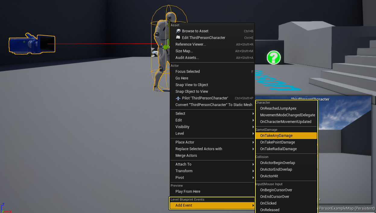 - 레벨에 있는 액터에 우클릭하면 나타나는 컨텍스트 메뉴에서 레벨 블루프린트 아래에서 추가하려는 이벤트를 선택합니다.