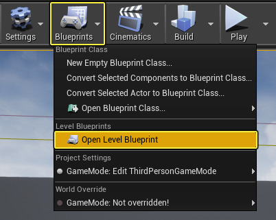 레벨 블루프린트를 열어 편집하려면, 레벨 에디터 툴바 에 있는 블루프린트 버튼을 클릭한 다음 레벨 블루프린트 열기 를 선택합니다.