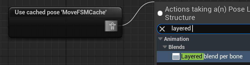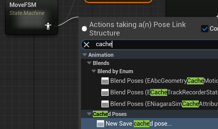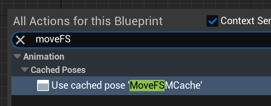 이름을 MoveFSMCache로 바꿔줍니다 MoveFSM의 카피본입니다. moveFS를 검색해서 Use cached pose를 넣어줍니다.