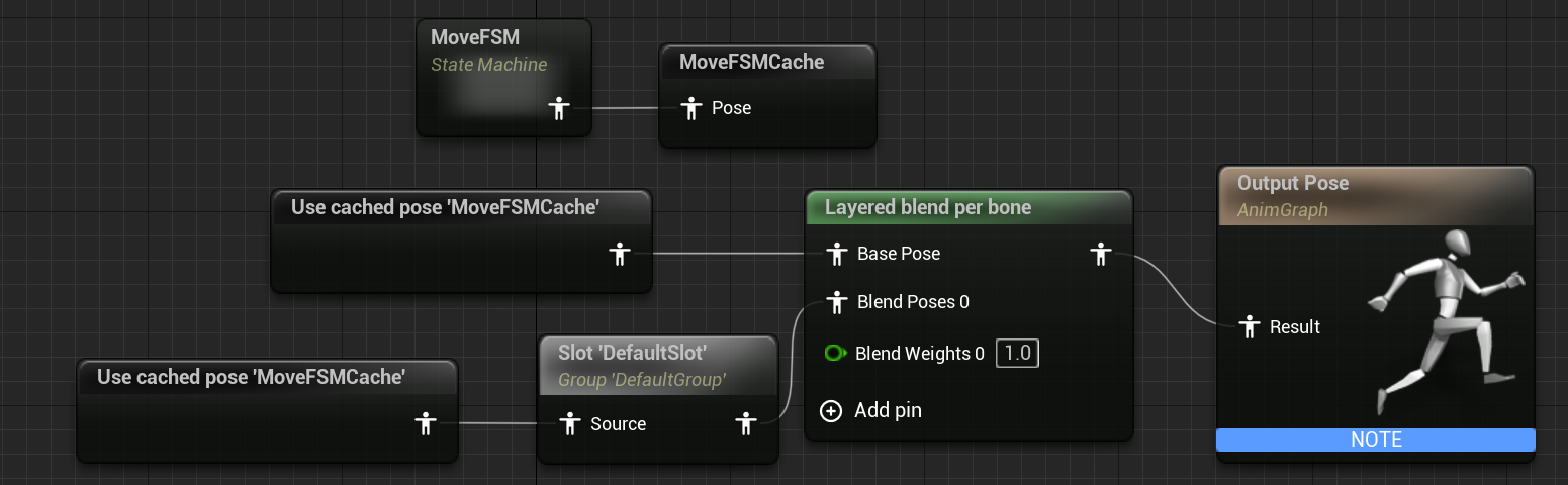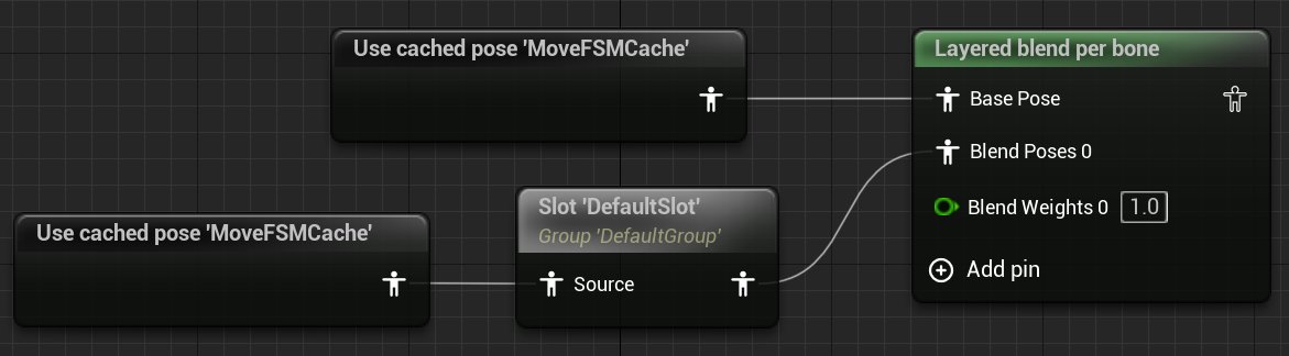 Slot DefaultSlot을 BlendPosed0에 연결해줍니다. Montage가 실행되면 이 Slot에서 실행되는데 Montage가 없는 경우 Source애니메이션이 실행되게 Used cached pose를 카피해서 연결해줍니다.