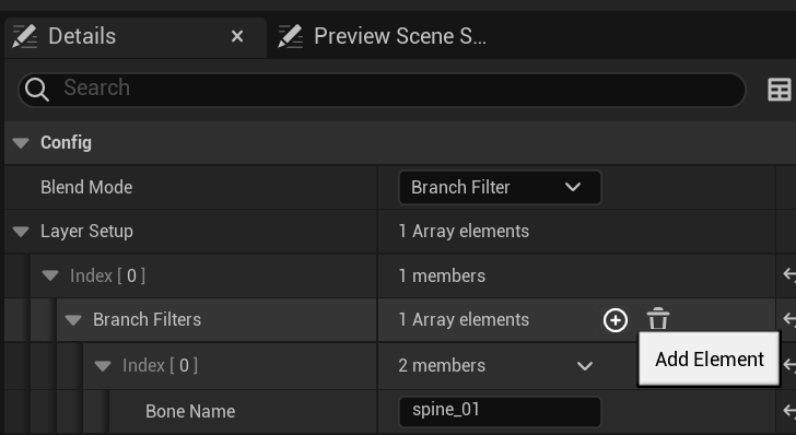 Layerd blend per bone을 선택하고 오른쪽 Detail창의 Branch Filters +를 눌러 Bone Name을 spine_01로 해줍니다. 이건