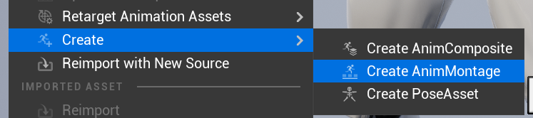 Animation StaterPack의 Fire_Rifle_IronSights 에셋을 찾아 우클릭후 Create Anim Montage메뉴를 선택합니다. Animation폴더로 이동시켜줍니다.