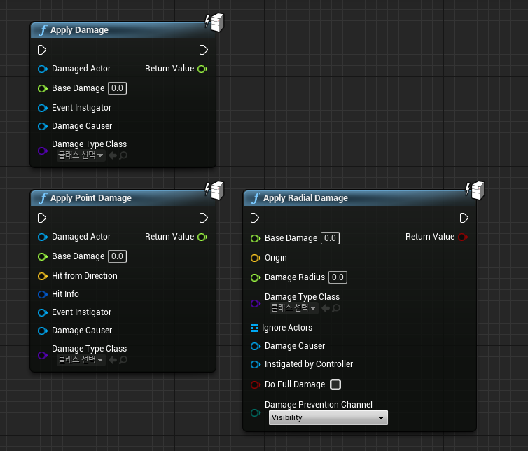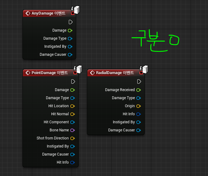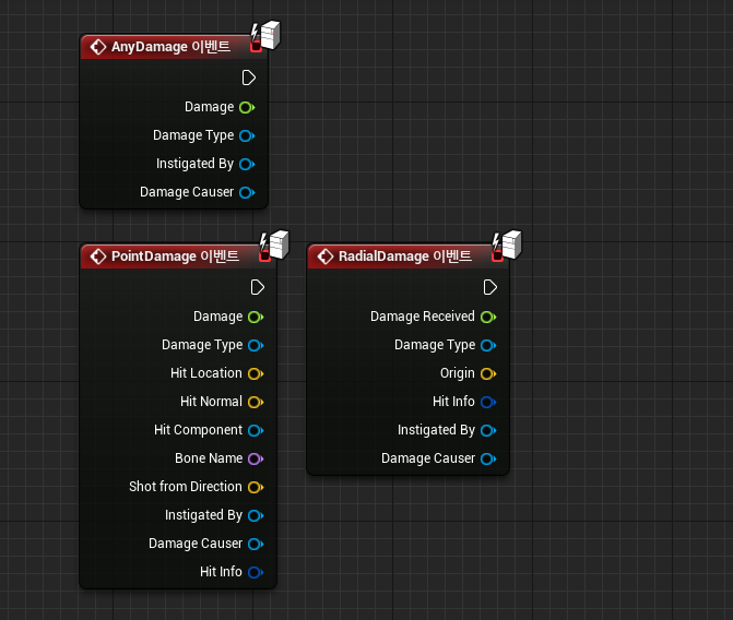 블루프린트 : AnyDamage 노드, PointDamage 노드, RadialDamage 노드. (쓰기 쉬우라고 구분되어 있음.)