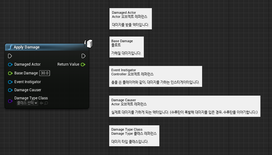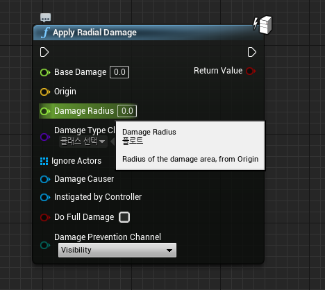 ApplyRadialDamage : 범위 데미지를 줄 때 사용. (Origin으로부터 Radius만큼 데미지를 뿌린다.라는 느낌.)