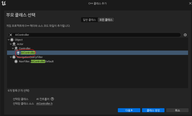 ● AI 컨트롤러를 생성하여 캐릭터에게 빙의하기 위해서는 AI Controller를 부모 클래스로 하는 AI 컨트롤러를 만들어줘야 한다.