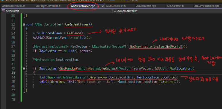 + NavigationSystem을 사용하기 위해서 ArenaBattle.Build.cs에서 "UMG"를 추가했던 것처럼 "NavigationSystem"을 추가해 줘야 한다.