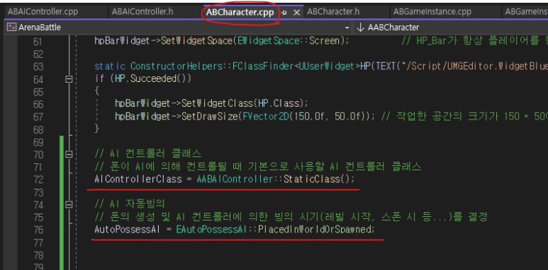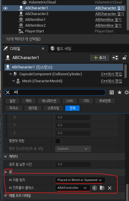 ● ABCharacter가 위에서 만든 ABAIController를 사용하도록 AIControllerClass(=AI 컨트롤러 클래스) 속성을 ABAIController의 클래스로 지정하고, AI 생성 옵션을 PlaceInWorldOrSpawned로 설정해 준다.