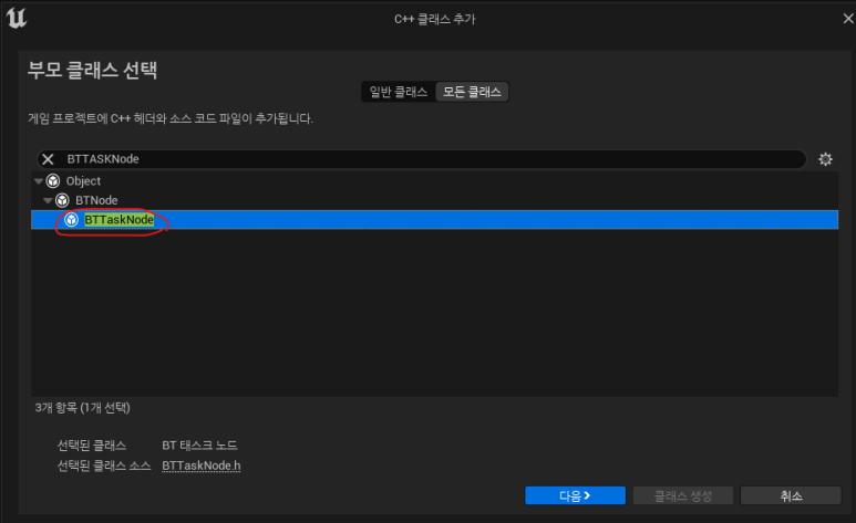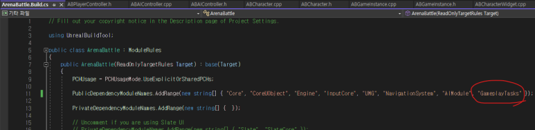 + 이때, 오류가 발생하는데, 이 에러는 관련 모듈을 참조할 수 없어 생기는 오류이다. 그러므로, ArenaBattle.Build.cs에 "GameplayTasks" 모듈을 추가해 주고 생성해야 한다.