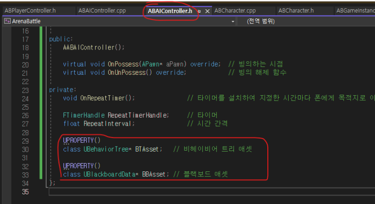 ● 그리고 ABAIController에서 UBehaviorTree 클래스와 UBlackboardData 클래스로 애셋을 추가할 수 있다.