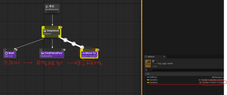 2. 이어서 시퀀스 컴포짓에 의해 Wait 태스크가 성공하면 FindPatrolPos 태스크를 수행하고,