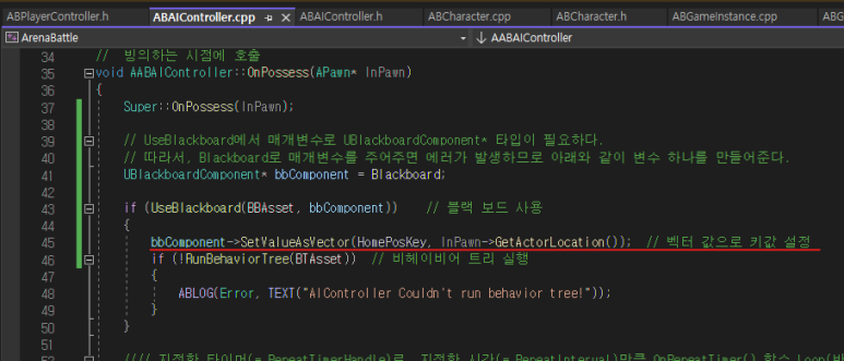 OnPossess() 함수에서 UseBlackboard() 함수를 사용하여 블랙보드 컴포넌트에서 BBAsset을 사용할 수 있게 해주고,