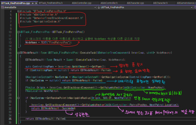 - GetRandomPointInNavigableRadius() 함수 : 내비게이션 시스템은 이동 가능한 목적지를 랜덤으로 가져오는 함수