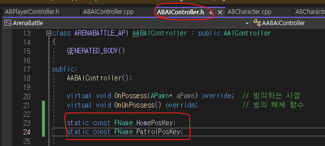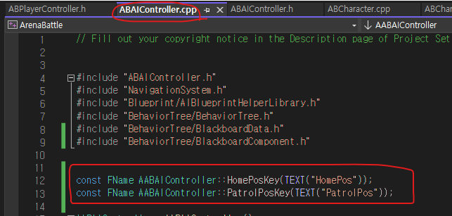 ABAIController.cpp에서 HomePosKey 변수를 생성하고, 이 변수의 키 이름을 HomePos로 지정하고,