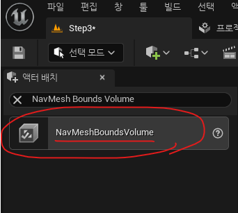 우선 내비게이션 메시로 NPC가 스스로 움직일 수 있는 범위를 만들어주어야 한다. 그러기 위해서 액터 배치 창에서 'NavMesh Bounds Volume'을 추가해 줘야 한다.