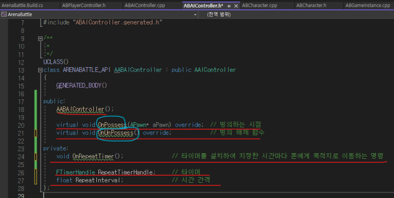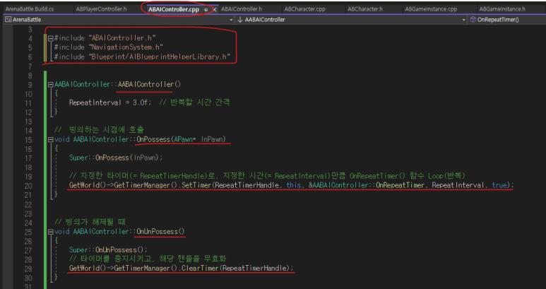 + OnUnPossess() 함수로 빙의가 끝나면, 타이머를 중지시켜, 함수가 반복 실행되는 것을 멈춘다.