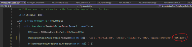● 방금 만든 블랙보드와 비헤이비어 트리 애셋을 이전에 만든 C++의 ABAIController에서 사용하려면(= 비헤이비어 트리 관련 기능을 사용하려면) ArenaBattle.Build.cs에 AIModule 모듈을 추가해 줘야 한다.