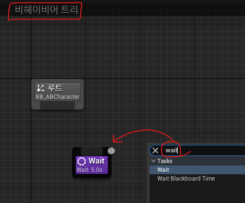 ● 만든 비헤이비어 트리에 들어가서 wait 태스크를 생성한다.