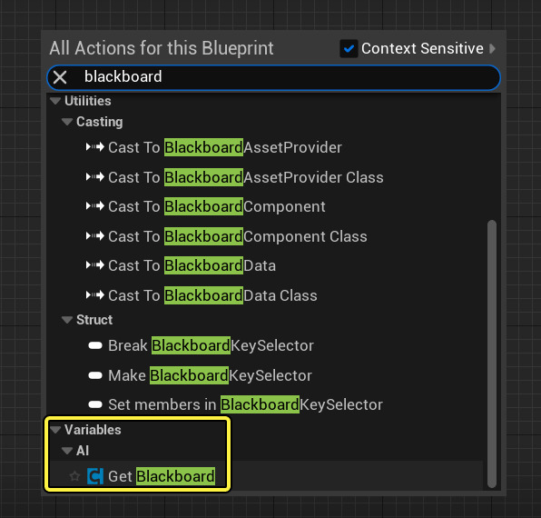 - 우클릭하고 Variables > AI 아래의 Get Blackboard 노드를 추가합니다.