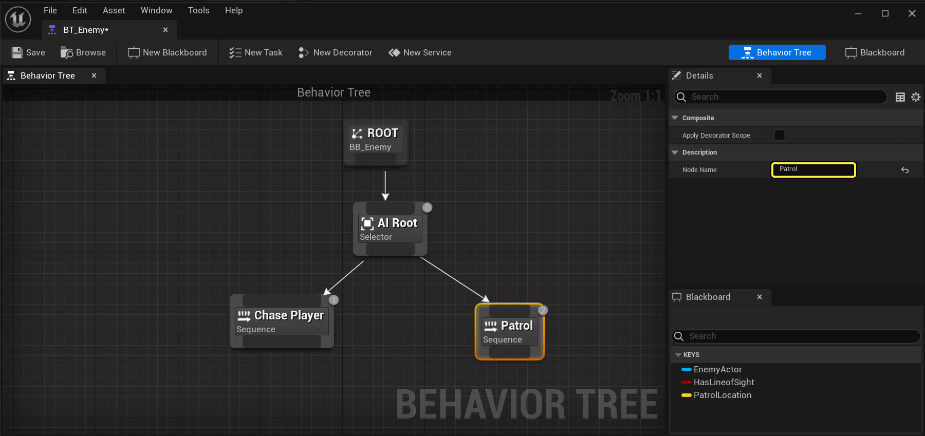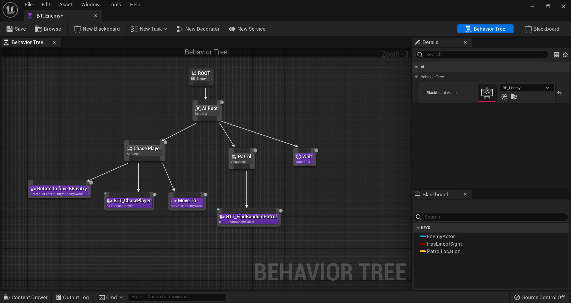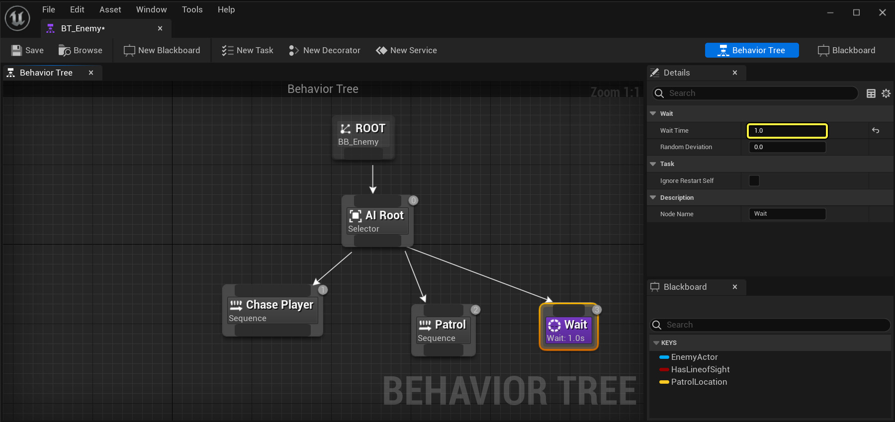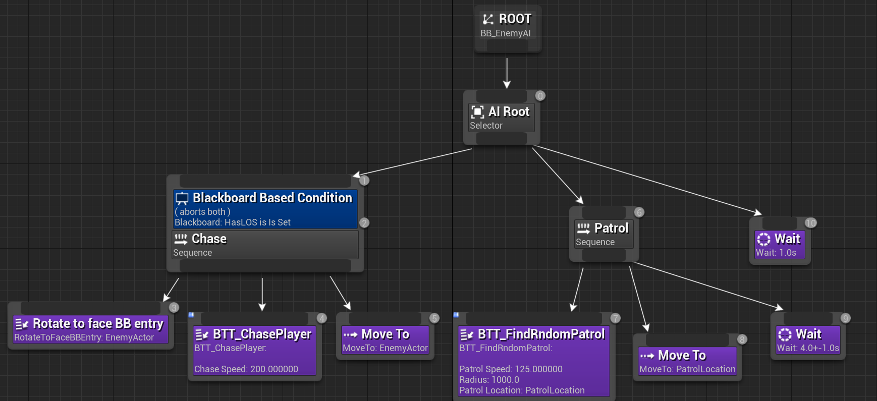 비헤이비어 트리 프레임워크가 완성되었습니다. 다음 단계에는 AI의 이동 속도를 변경하고, AI가 순찰 중에 이동할 랜덤 위치를 찾고, AI가 플레이어를 추격할지 순찰할지 결정하는 로직을 추가하겠습니다.