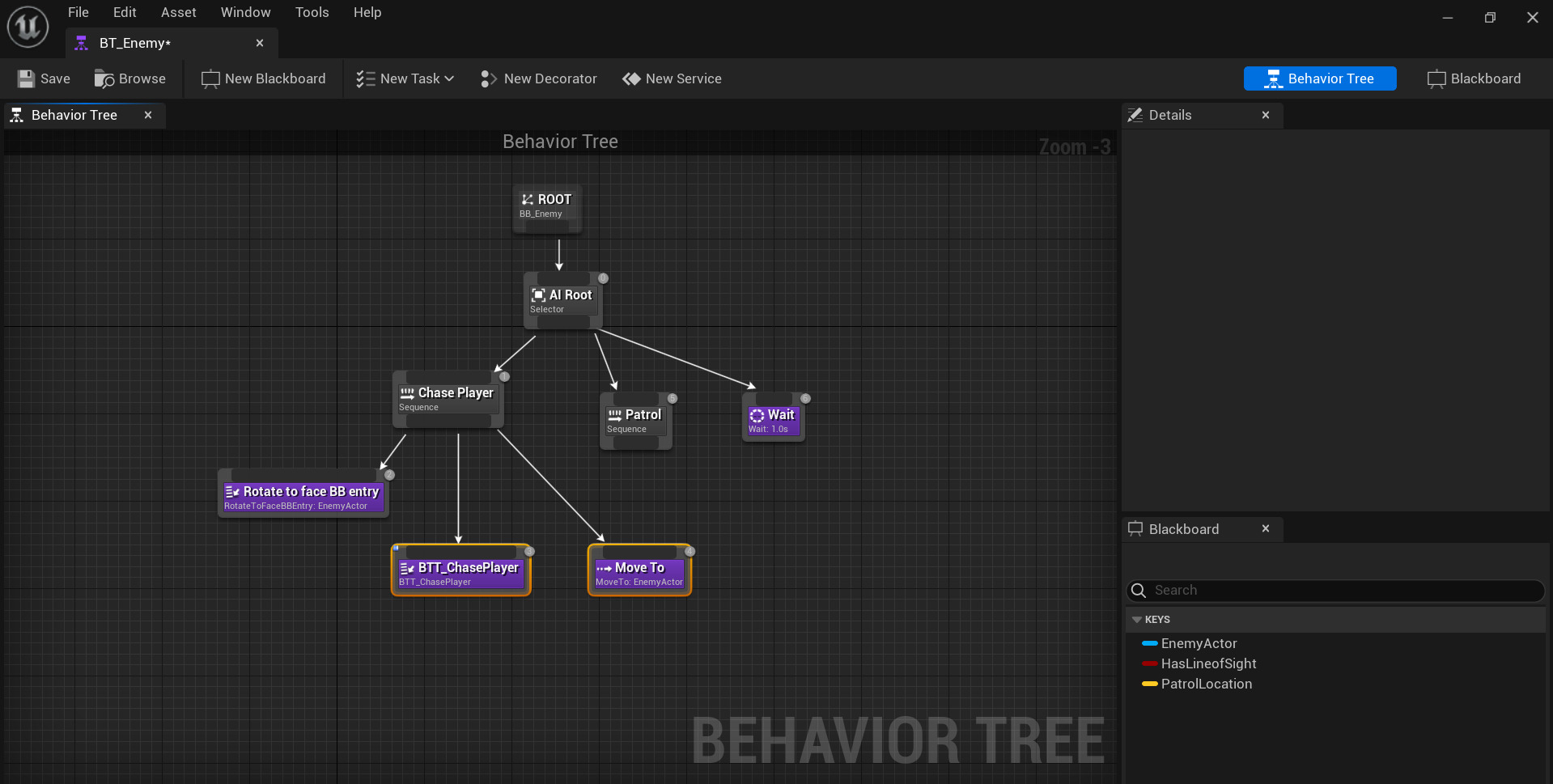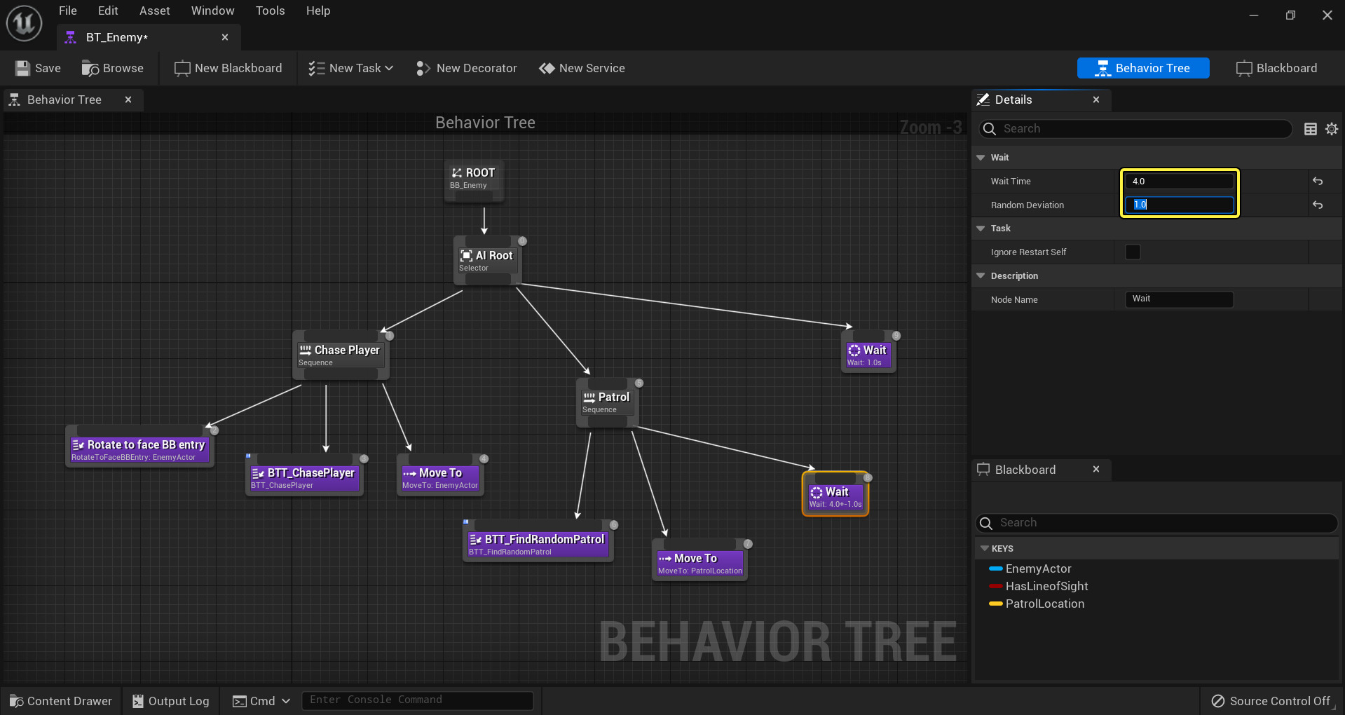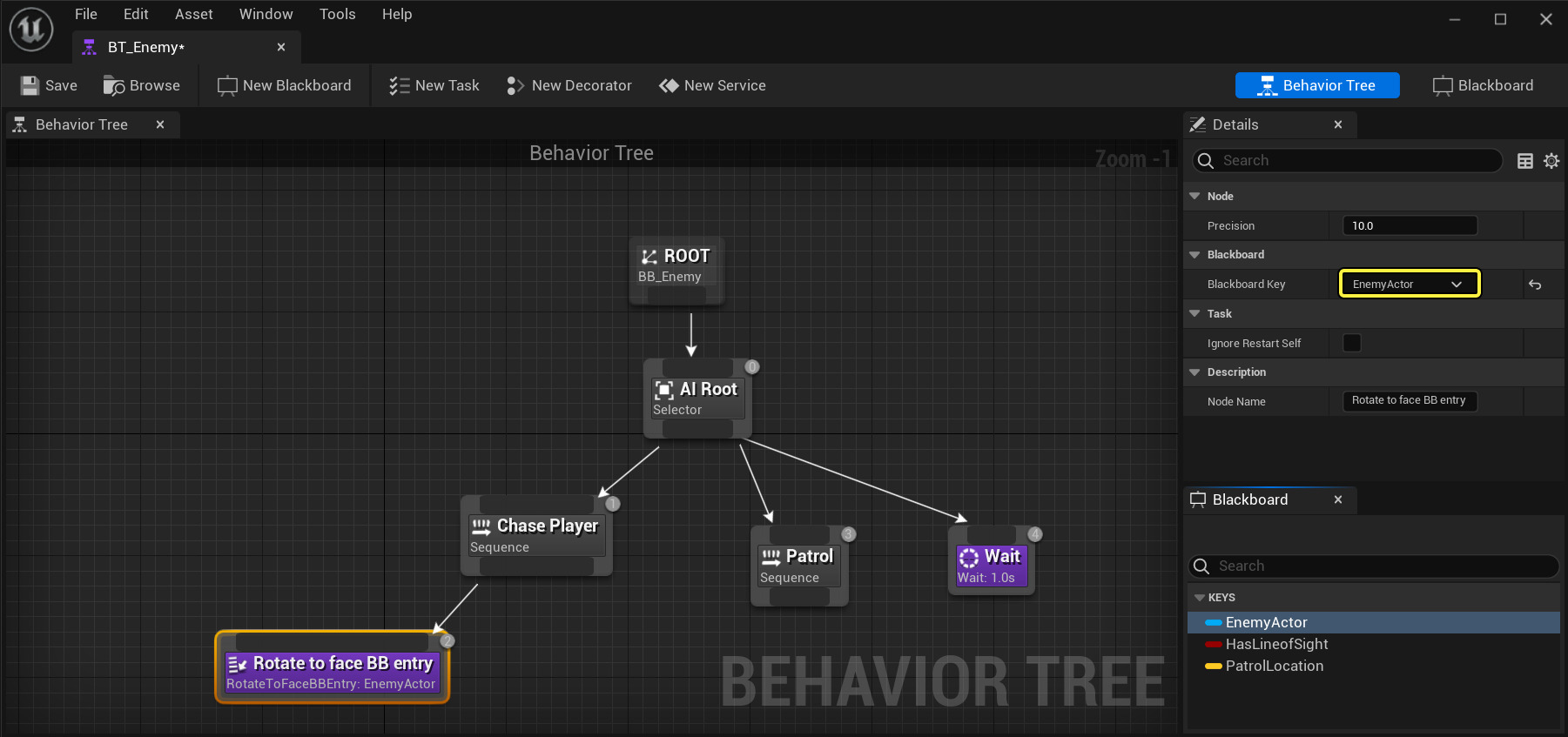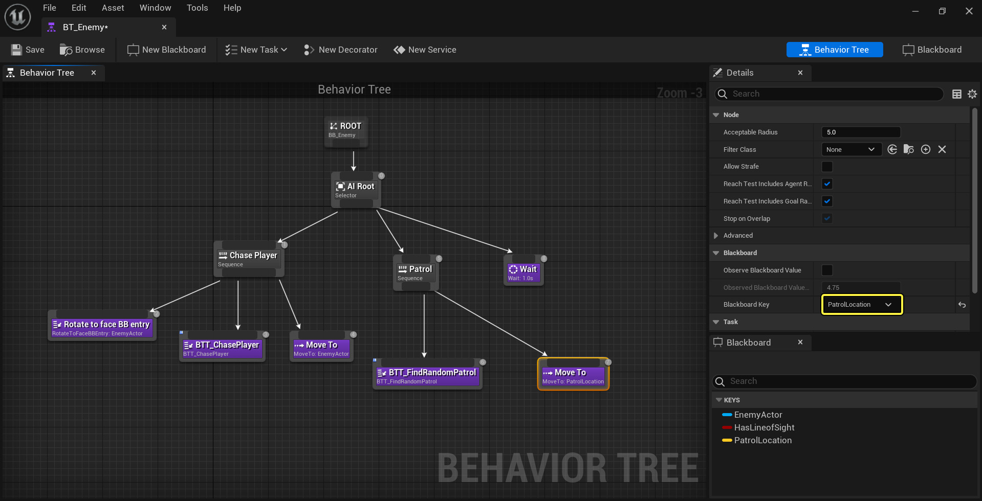 비헤이비어 트리 프레임워크가 완성되었습니다. 다음 단계에는 AI의 이동 속도를 변경하고, AI가 순찰 중에 이동할 랜덤 위치를 찾고, AI가 플레이어를 추격할지 순찰할지 결정하는 로직을 추가하겠습니다.