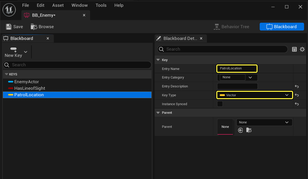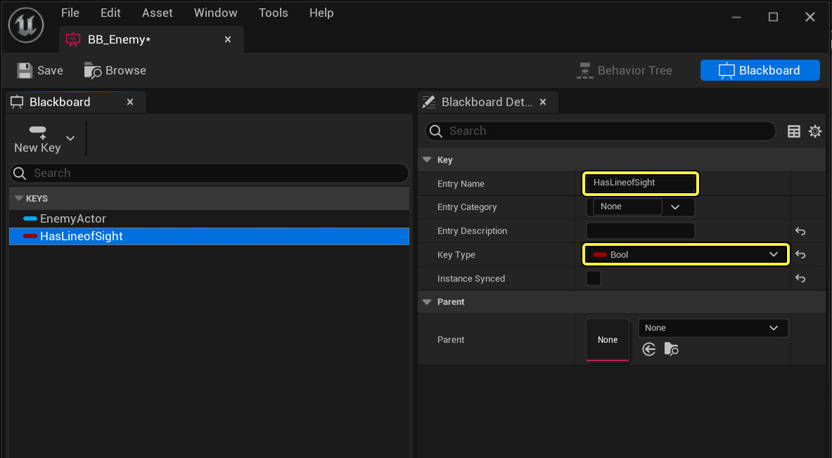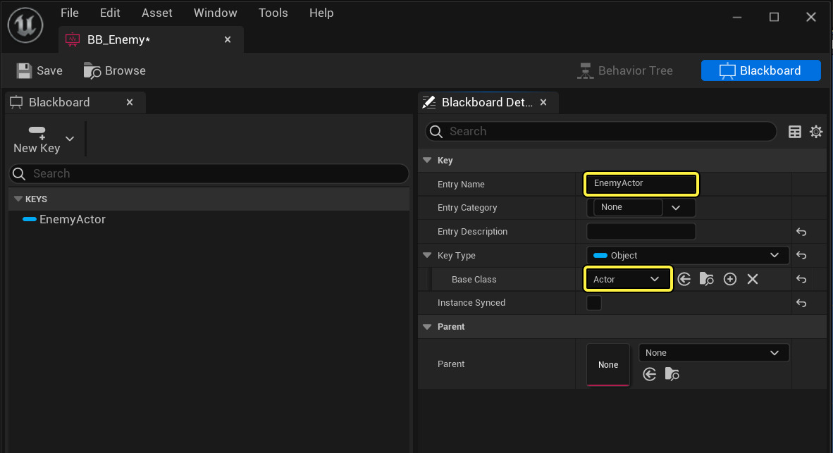 - 방금 생성한 블랙보드 키 를 찾을 수 없다면 노란색 화살표를 클릭하여 블랙보드 에셋 을 초기화한 다음 Enemy_BB 를 재할당하여 키를 새로고침합니다.