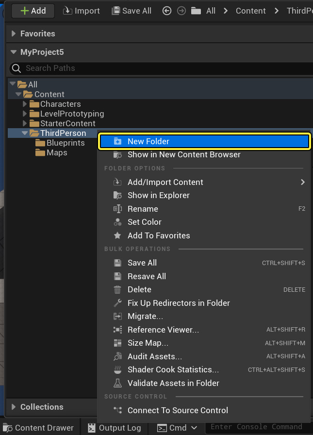 - 콘텐츠 드로어(Content Drawer) 를 열고 ThirdPerson 폴더를 우클릭하여 새 폴더(New Folder) 를 생성하고 AI 로 명명합니다.