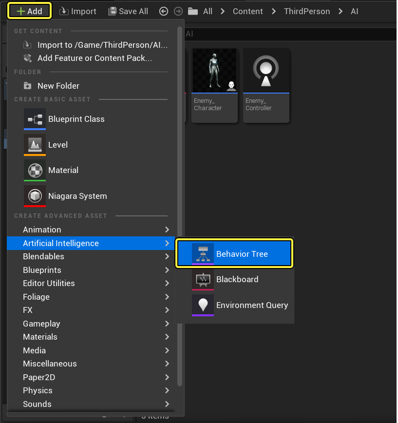 - 콘텐츠 드로어(Content Drawer) 에서 +추가(+Add) 를 클릭한 후 인공 지능(Artificial Intelligence) 에서 비헤이비어 트리 를 선택하고 BT_Enemy 로 이름 짓습니다.