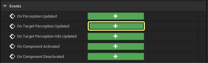 - AIPerception 의 이벤트(Events) 섹션에서 타깃 퍼셉션 업데이트 시(On Target Perception Updated) 옆의 + 표시를 클릭합니다.