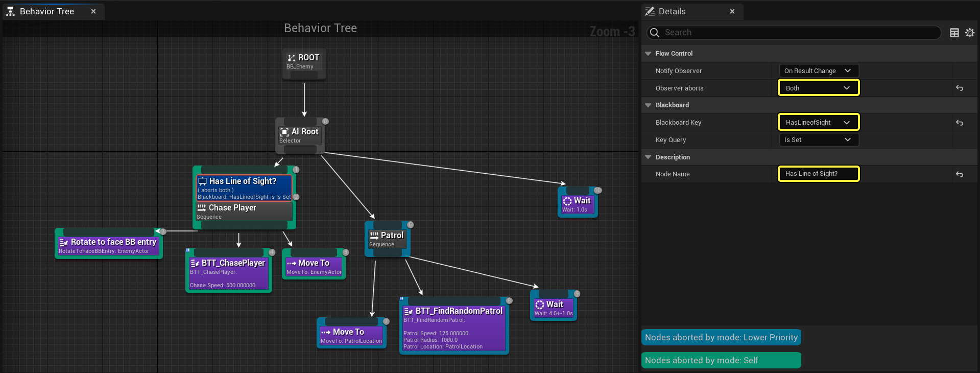 이 마지막 섹션에서는 플레이어 캐릭터와 적 캐릭터 블루프린트의 일부 세팅을 조정합니다. 또한 비헤이비어 트리 에서 특정 조건에 따라 진입할 분기를 정해 줄 데코레이터(Decorator) 를 구성합니다.
