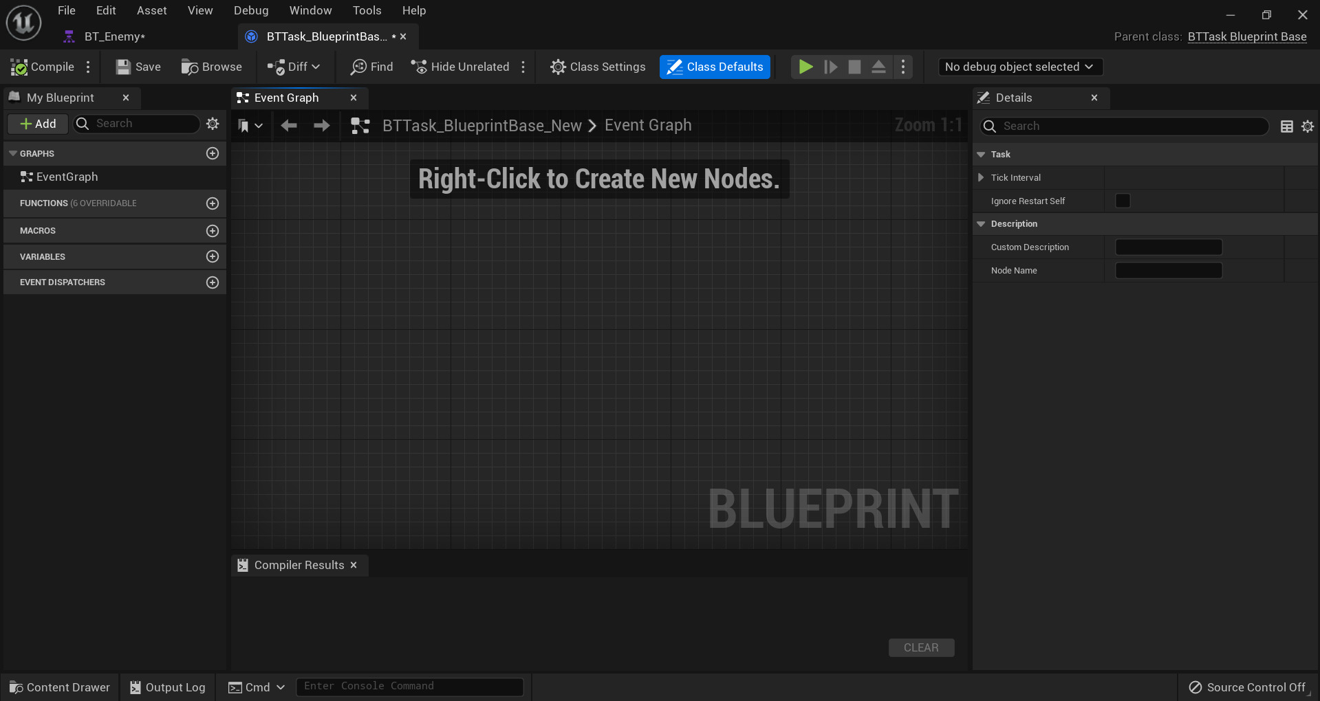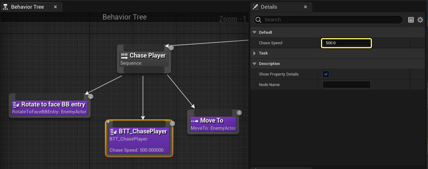 새로 추가한 태스크에는 아직 아무 로직도 없지만, AI 캐릭터가 이동 속도를 변경하여 EnemyActor(플레이어)를 향해 이동하는 로직을 나중에 추가하겠습니다.이미지를 클릭하면 최대 크기로 볼 수 있습니다.