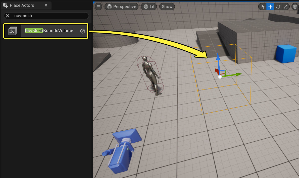 - 액터 배치(Place Actors) 패널에서 NavMeshBoundsVolume 을 레벨로 드래그합니다.