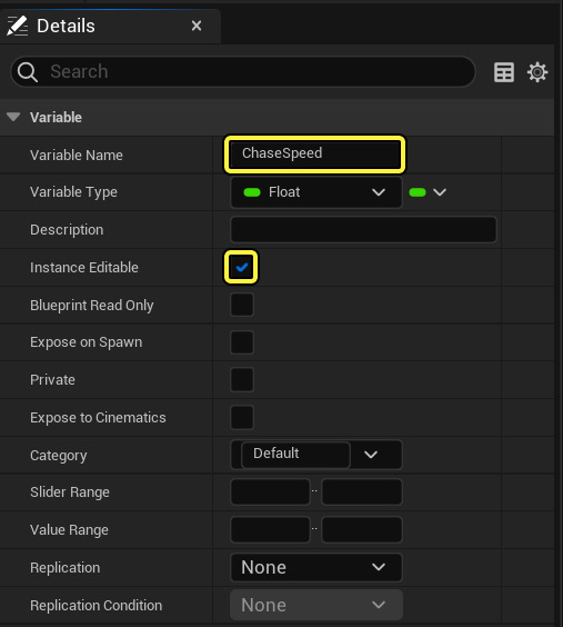 - ChaseSpeed 의 인스턴스 편집가능(Instance Editable) 옵션을 활성화합니다.