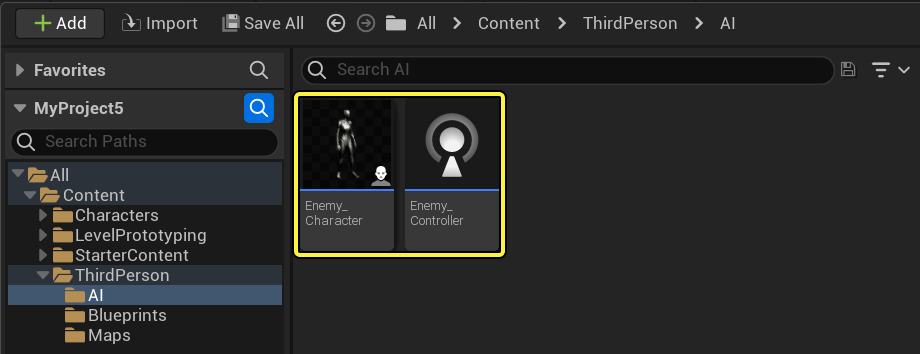 - AIController 블루프린트는 Enemy_Controller 로, BP_ThirdPersonCharacter 블루프린트는 Enemy_Character 로 이름을 변경합니다.