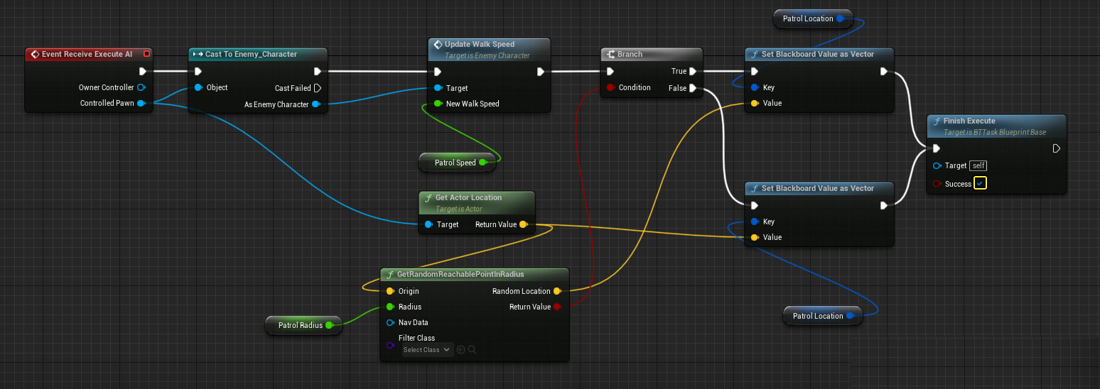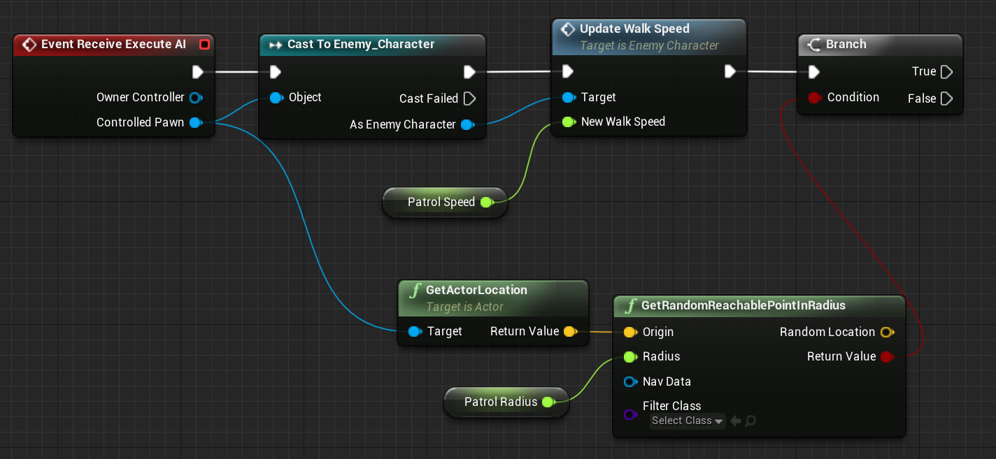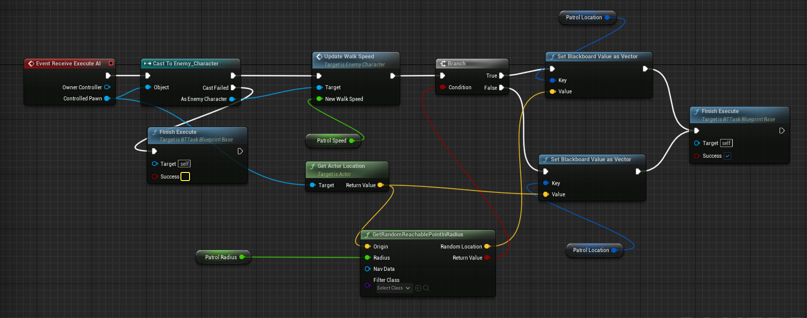 - Patrol Radius(기본값) : 1000.0 - 그러면 적 캐릭터는 현재 위치에서 1,000유닛 이내의 랜덤 위치를 찾게 됩니다. 또한 Branch 노드를 사용하여 이동할 수 있는 랜덤 위치를 찾지 못하는 엣지 케이스를 처리합니다.