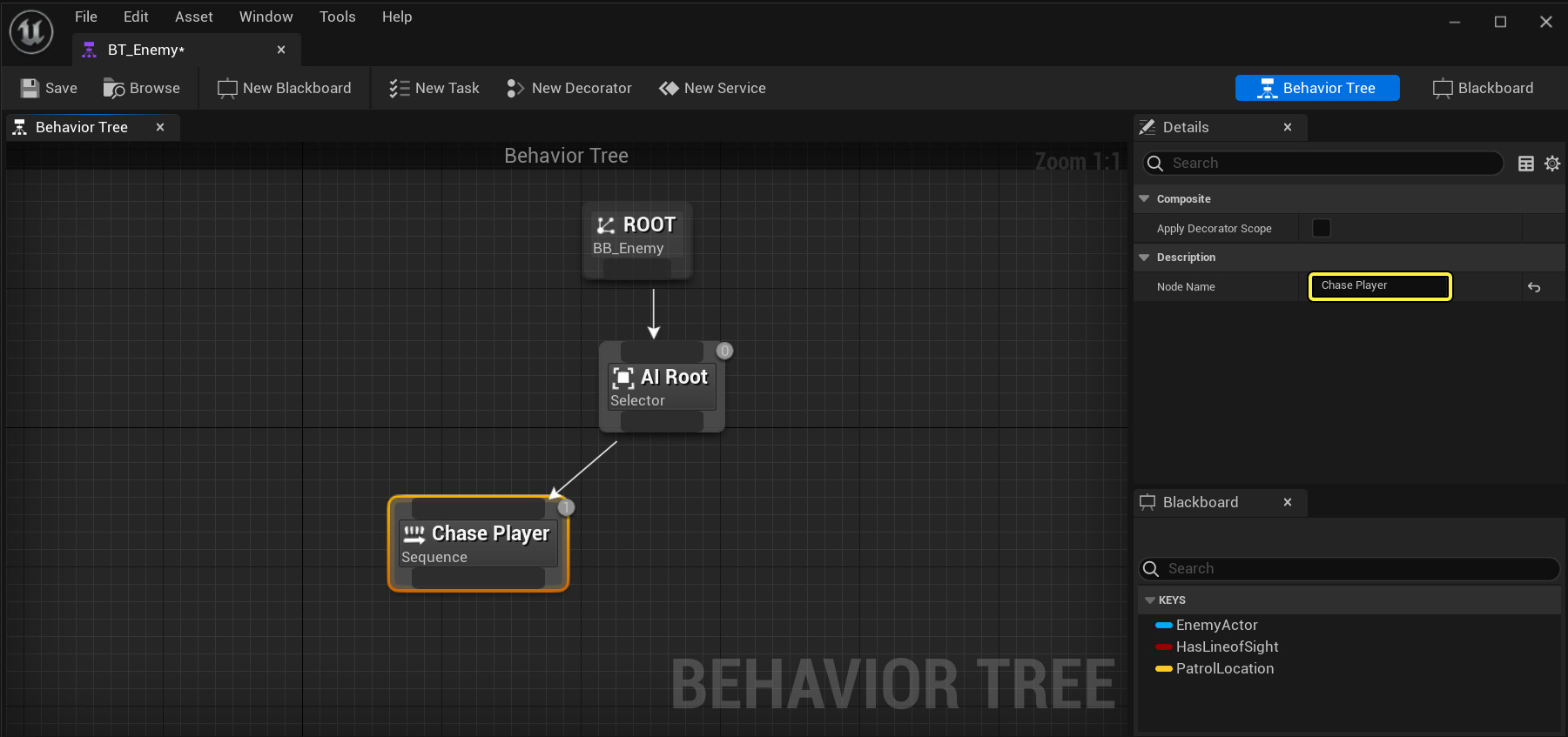 - AI Root 를 좌클릭하고 드래그하여 Sequence 노드를 추가하고 Chase Player 로 이름 짓습니다.