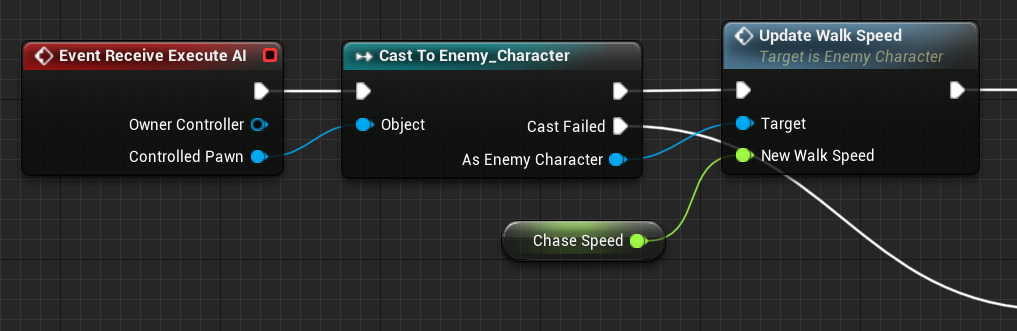 이 함수는 비헤이비어 트리에서 호출되어 AI의 이동 속도를 변경하는 데 사용됩니다. - 기술적으로는 Chase Player 태스크의 형변환 노드로부터 캐릭터 무브먼트(Character Movement) 컴포넌트에 액세스하여 해당 태스크 안에서 이동 속도를 조정할 수 있지만, 비헤이비어 트리가 서브 오브젝트의 프로퍼티를 직접 변경하게 하는 것이 권장되는 모범 사례라고 할 수는 없습니다. 그 대신 비헤이비어 트리가 캐릭터 안의 함수를 호출하여 필요에 따라 조정하도록 하겠습니다.