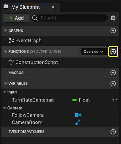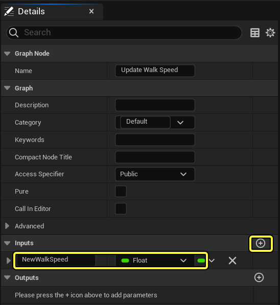 - Update Walk Speed 함수의 디테일(Details) 패널에서 NewWalkSpeed 라는 플로트 입력을 추가합니다.