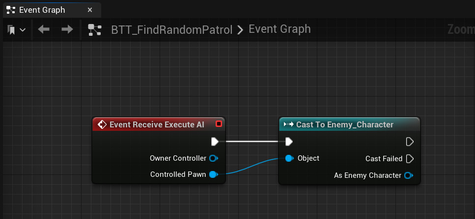 - BTT_FindRandomPatrol 안에서 이벤트 Receive Execute AI 와 Enemy_Character에 형변환 을 연결합니다.