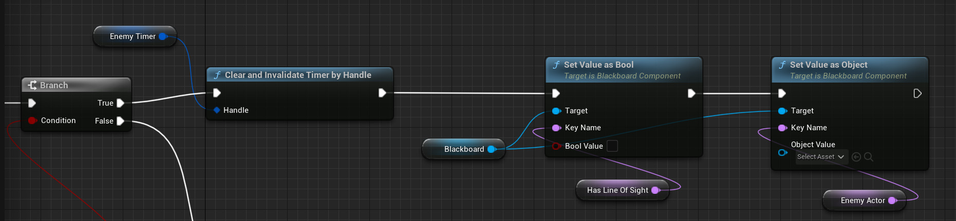 - Branch 의 True 에서 Get EnemyTimer 를 사용하고 Clear and Invalidate Timer by Handle 에 연결합니다.