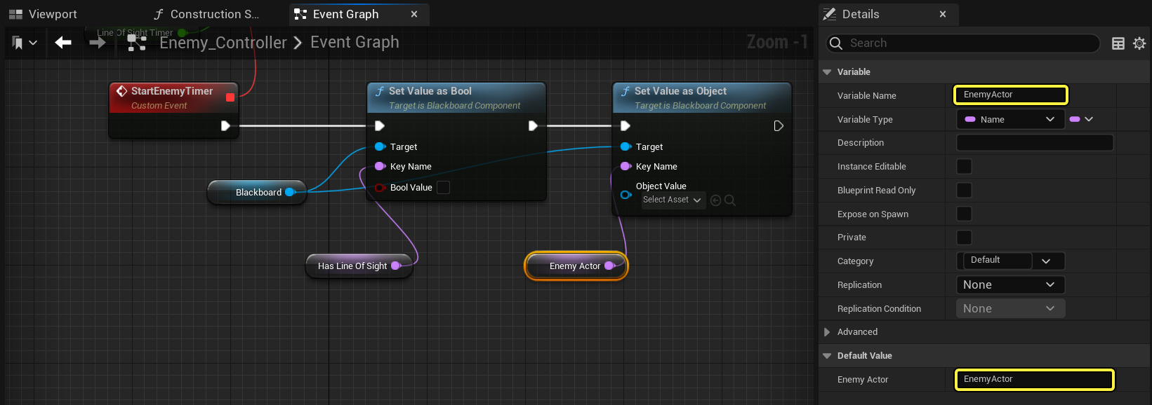 - Key Name 을 둘 다 우클릭하여 변수 로 승격한 후 각각 HasLineOfSight 와 EnemyActor 로 이름 짓습니다.