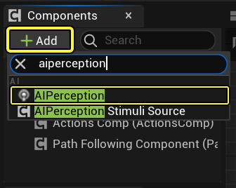 - 컴포넌트(Components) 창에서 +추가 를 클릭하여 AI 퍼셉션 컴포넌트(AIPerception Component) 를 검색하고 추가합니다.