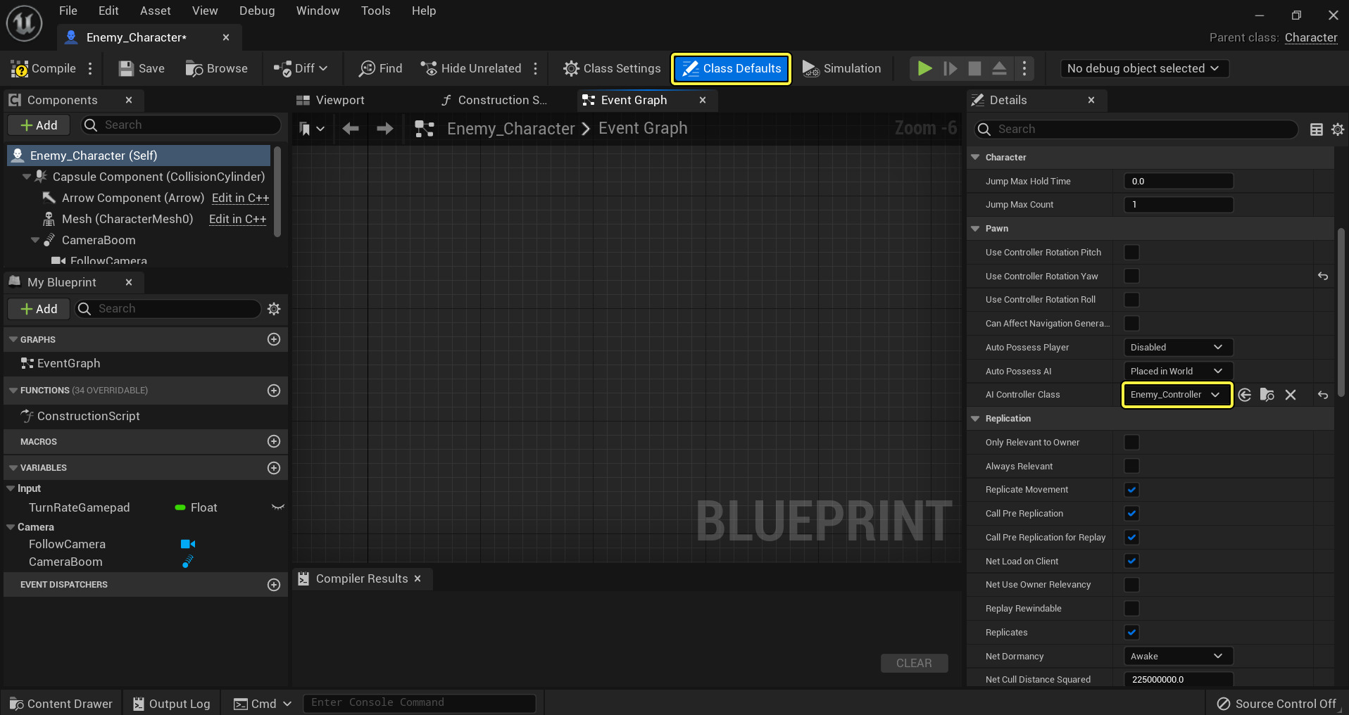 - 툴바에서 클래스 디폴트(Class Defaults) 를 선택하고 디테일 패널에서 AI 컨트롤러 클래스(AI Controller Class) 에 Enemy_Controller 를 할당합니다.